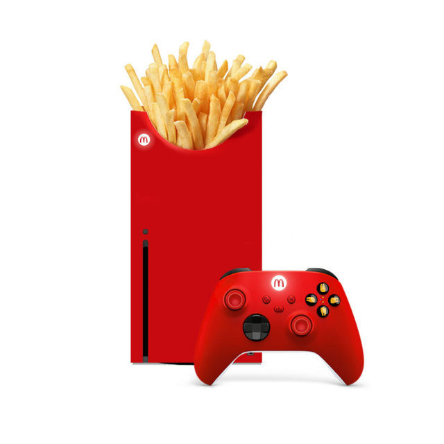 眼看「話題人物」來了,麥當勞則是以P上自家LOGO與表情符號的Xbox無線控制器來做為回應。有趣的是,Xbox則是以附有麥當勞M字LOGO的「麥當勞紅」Xbox Series X主機做為回禮,這讓美國麥當勞終於忍不住逗趣表示:「你是不是也想收購我?」