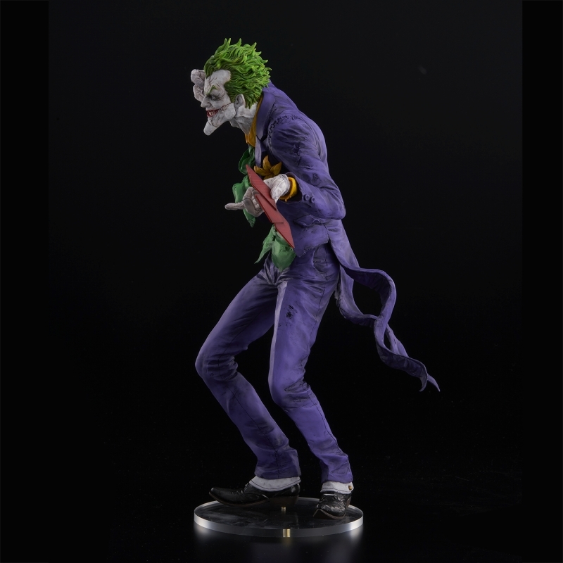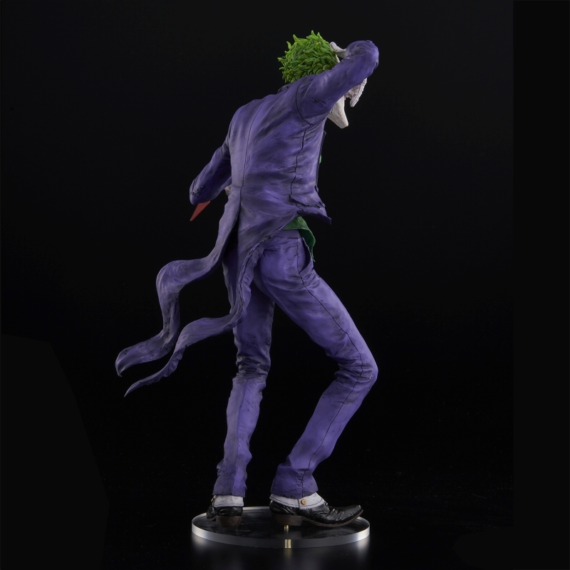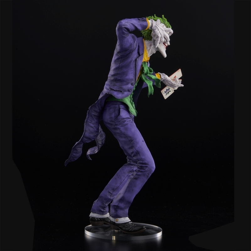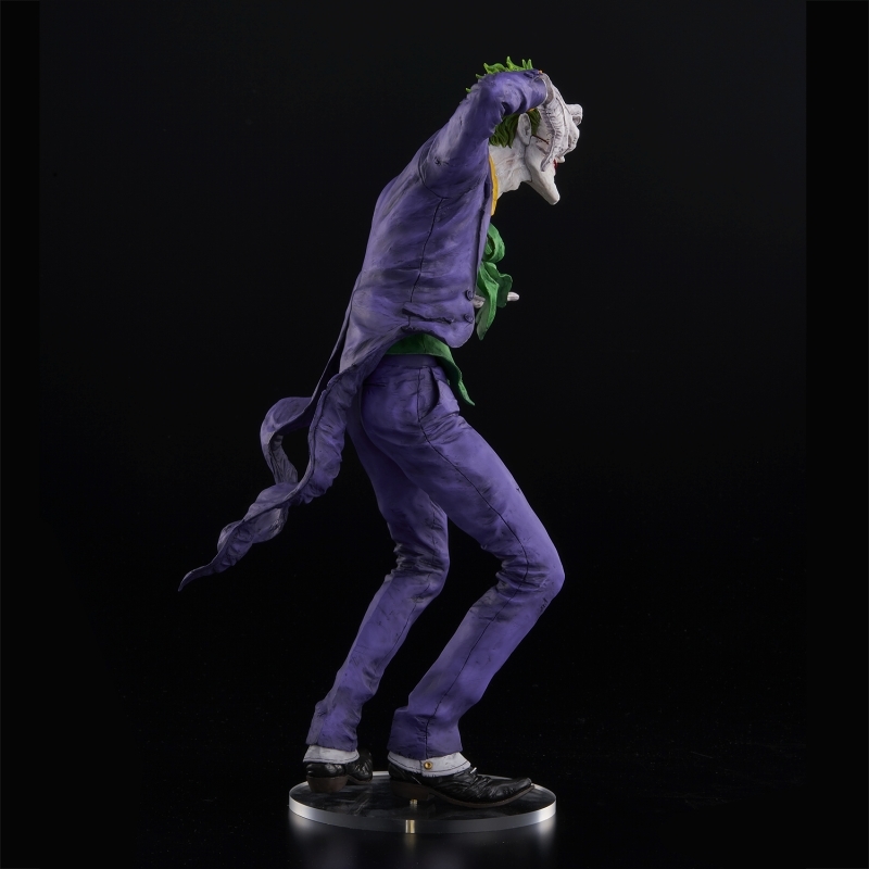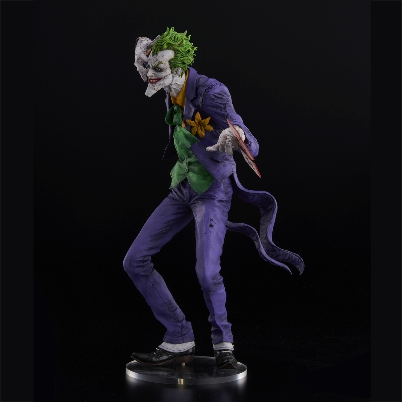 這次的「sofbinal 小丑」高約 30 公分,採用 PVC、ABS 為材質製作,原型是由 サイトウヒール 操刀,而負責同系列蝙蝠俠的原型師岩倉圭二則是擔任監修,打造出身穿紫綠拼黃西裝、手裡拿著撲克牌的犯罪王子,因動作而產生的衣裝皺褶十分逼真、細膩,還可以在左肩處看到醒目的縫補痕跡,另外,蒼白的面容、長度誇張的下巴,更散發出一股非一般常人的詭異氣息!