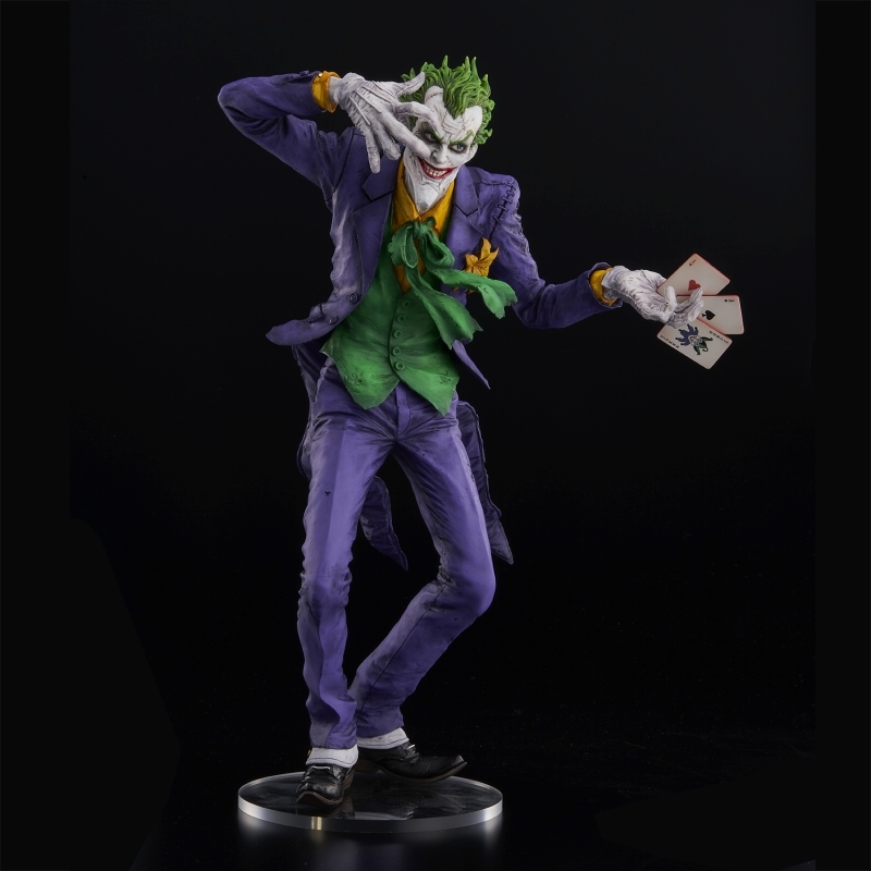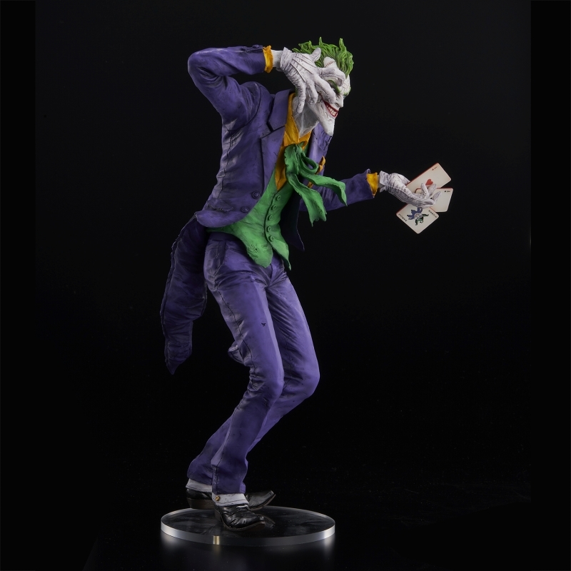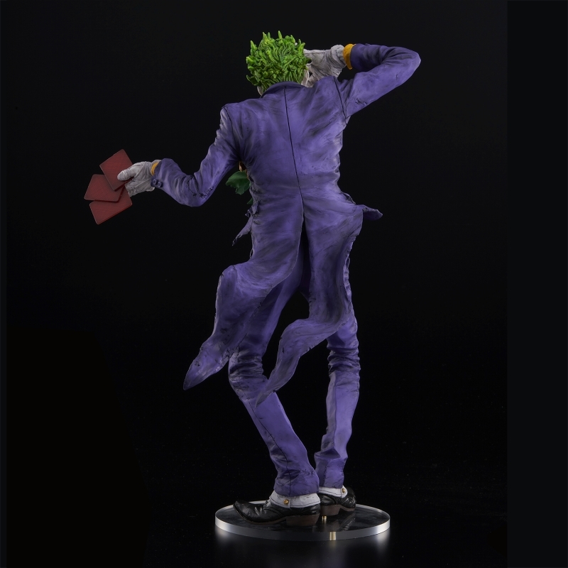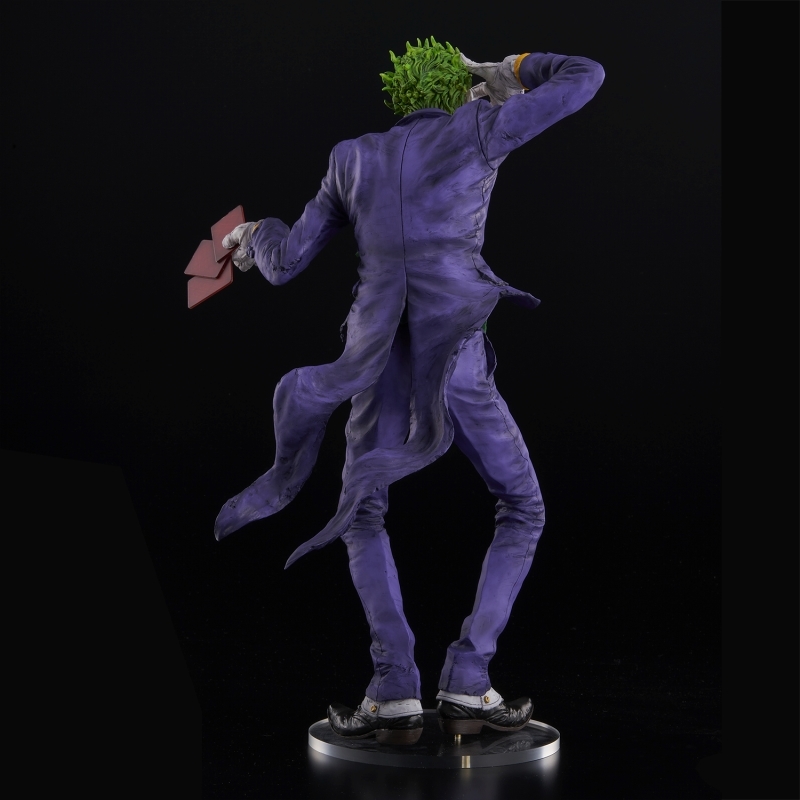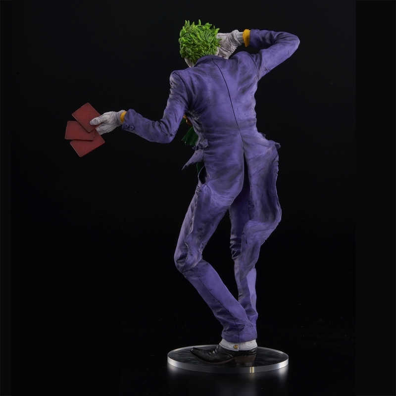 這次的「sofbinal 小丑」高約 30 公分,採用 PVC、ABS 為材質製作,原型是由 サイトウヒール 操刀,而負責同系列蝙蝠俠的原型師岩倉圭二則是擔任監修,打造出身穿紫綠拼黃西裝、手裡拿著撲克牌的犯罪王子,因動作而產生的衣裝皺褶十分逼真、細膩,還可以在左肩處看到醒目的縫補痕跡,另外,蒼白的面容、長度誇張的下巴,更散發出一股非一般常人的詭異氣息!