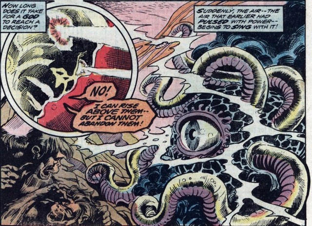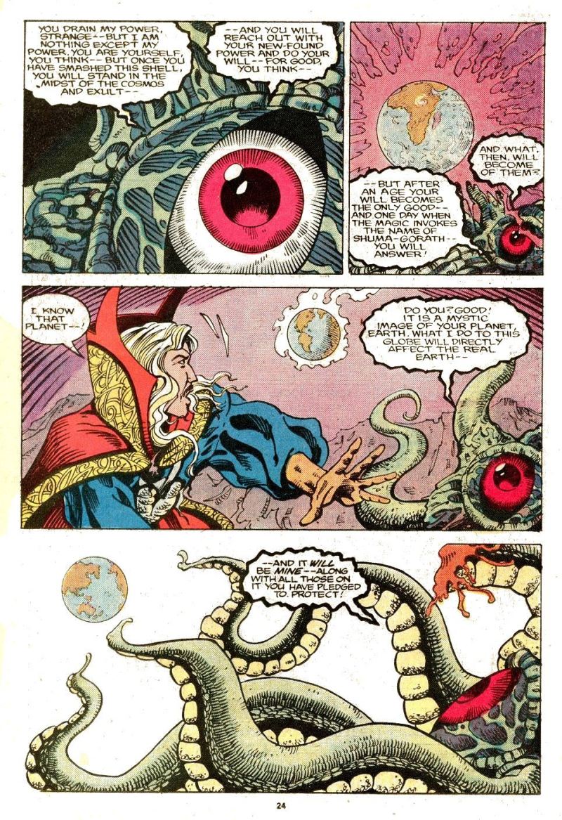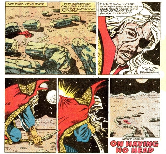 然而,Shuma-Gorath的本體正是那股能量本身,奇異博士的舉動只是把自己與Shuma-Gorath同化而已。他們之間的戰鬥波及到地球,造成了許多災害,最後博士也真的與Shuma-Gorath合為一體,但是在勉強保有控制的情況下及時自我了斷,看似消滅了這個惡魔。最後卡魯及時將奇異博士的靈魂帶回地球,清除了這個惡魔造成的汙染,但是Shuma-Gorath也在自己的維度內重新復活。