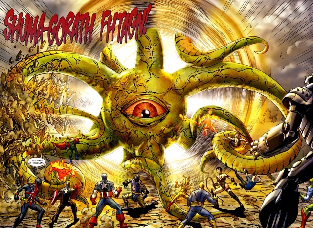 起源Shuma-Gorath是漫威宇宙中,比大家熟知的角色們所處的宇宙本身還要古老的「古神」(Old Ones)之一。祂的形象是有著許多觸手和一顆巨大眼球的怪物,不只在創作上完全衍生自「克蘇魯神話」(Cthulhu Mythos),也被漫威宇宙中的許多人認為就是克蘇魯本尊。