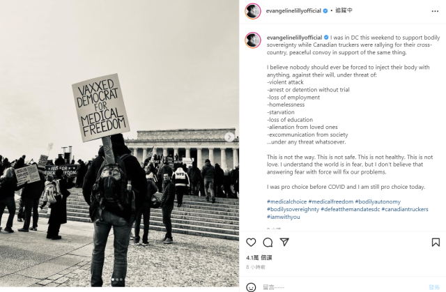 伊凡潔琳莉莉在 Instagram 寫道:「這個週末我在華盛頓特區現身支持身體自主權,而加拿大的卡車司機們也正在集結全國的車隊支持同樣的事情。我相信任何人都不該被強迫違背自己的意願,並在受到以下威脅的時候向自己的身體注射任何東西,如:暴力攻擊、未經審判逮捕或拘留、失業、無家可歸、飢餓、教育損失、與親人疏遠、被社會逐出教會,及其它形式的威脅。這不是解決之道,這是不安全、不健康、不是出自於關愛的作法。 我知道世界正處於恐懼之中,但我不相信用武力回應恐懼會解決我們的問題。在疫情發生之前,我支持 Pro-choice(婦女有權選擇墮胎),現在依然也是。」