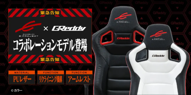 先前介紹過由《新世紀福音戰士》官方 Khara 所組成的電競戰隊 「エヴァ:e」,結合旗下電競週邊商品系列「EVANGELION e:PROJECT」。近日宣布將與日本汽車改裝品牌 GReddy 合作,推出戰隊 「エヴァ:e」 專屬的電競椅,以 NERV 組織為靈感打造,並結合電競戰隊形象製作。售價為 82,500 日圓,目前可於 GReddy 線上商城訂購。