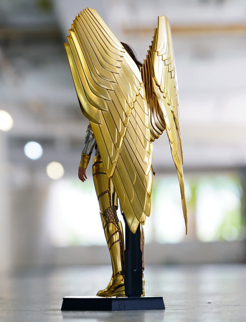 主體高約 30.5 cm,全身共 28 處可動,再現了 WW84 劇情後段身披黃金戰甲的黛安娜。內層布料緊身衣搭配擁有層次感的肩甲、胸甲及腿部的細節,前臂位置的守護銀鐲亦忠實地還原,真言套索亦可掛在腰際,收納狀態的翅膀以替換零件的方法可以裝組在背上。頭雕也可以選擇有戴上或脫去頭盔兩種造型。重點當然是頭雕以植髮技術製作,使整體的真實感提升!