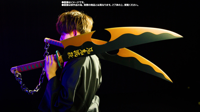 「PROPLICA 日輪刀(宇髓天元)」採用 ABS 製的刀體、鎖鏈與部分合金材質零件,單一把刀就長達 110 公分,徹底再現特色的橙黃色刀刃、圓形缺口以及刀刃上的「惡鬼滅殺」刻紋,刀柄連結雙刃的鎖鏈部分也極具金屬質感,相比過去日輪刀商品拿在手中極具份量!