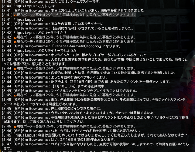 位在チョコボ伺服器的日本玩家 Anima ,近日在推特上分享了自己被Ban的過程。據 Anima 上傳的圖片顯示,他被《FF14》的GM抓到所謂的「小房間」。 GM表示, Anima 的其中一名雇員的名稱「含有歧視意思」,因此將會把 Anima 的帳號凍結至 2 月 10 日。讓 Anima 抱怨「我怎麼可能完全了解世界各國的歧視用語,這樣就Ban也太過分。」