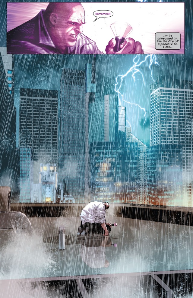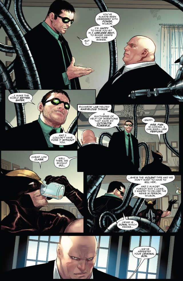 而市長這邊,八爪博士先前在幫費斯克設計利用紫人能力的寶石時順便給自己做了可以免疫其能力的裝置,現在更是挾帶著多元宇宙的其他八爪和大批的八爪無人機實質掌控了城市,並把費斯克當成傀儡來看待,還逮捕了費斯克的一個罪犯兒子。