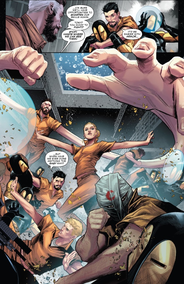 那些被關押在監獄裡的超級英雄們呢?由於那些超能力抑制項圈是神奇先生在超人類內戰時期開發出來的,所以他和老婆隱形女兩人都很輕鬆地各自解開了束縛,並帶著同樣進了監獄的鐵拳、月光騎士和鋼鐵人(本人)逃獄啦!