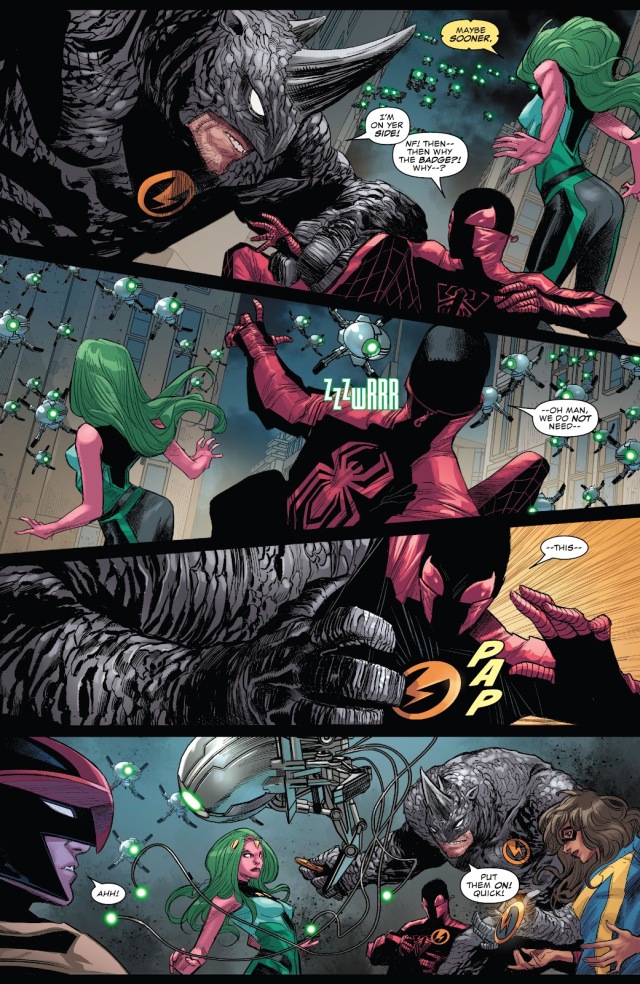 另一方面,雷霆特攻隊成員犀牛人看似找上了冠軍小隊(Champions)的麻煩,但是他其實是因為受不了費斯克要對小孩動手的關係而跑來找他們幫忙,並給了他們可以防止無人機攻擊的徽章。這個消息也被二代蜘蛛人帶給了躲在地下的英雄們,於是他們決定要在費斯克之前找到紫人的孩子們。