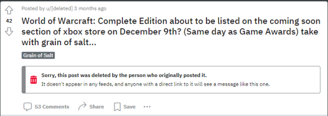 儘管這則貼文後來遭到刪除,儘管這則消息也的確尚未得到官方的確認,但有鑑於後來又爆發出微軟收購動視暴雪的重大新聞,讓當時的這則傳聞再次被帶出話題,特別是對於家中電腦狀況不是那麼好的玩家來說,他們無非希望《魔獸世界》能夠在Xbox Series X/S主機上遊玩。