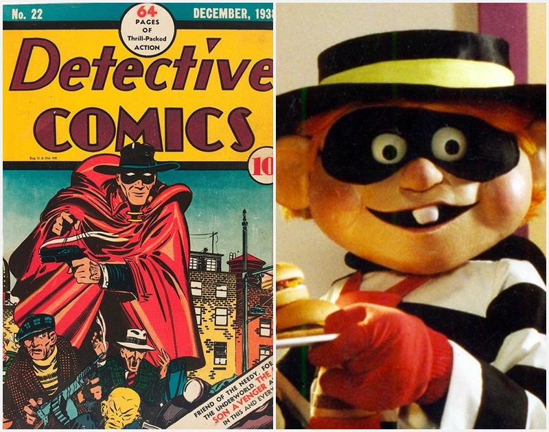 當宋警官帶隊來抓「和平使者」後,在警隊中當「和平使者」線人的隊長將他們放走,並且隨意形容了一個殺害了同僚的嫌疑人模樣:白人、紅頭髮、條紋上衣、紅領帶、黑色面罩和黑頂帽。這很明顯是麥當勞吉祥物「漢堡神偷(Hamburglar)」的形象,但是在DC漫畫史上,初代「緋紅復仇者」(Crimson Avenger)在1938年初登場時也是類似的形象。