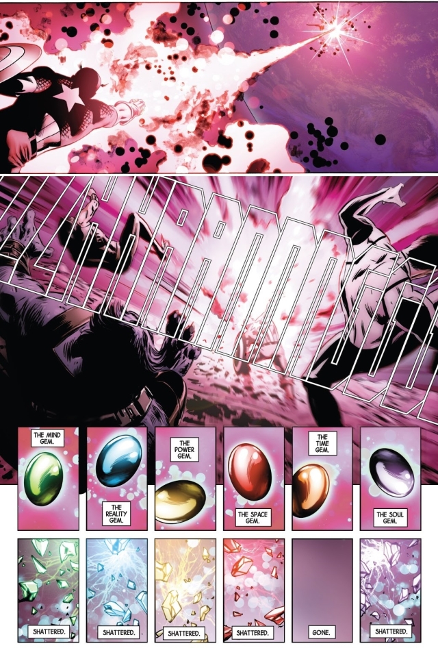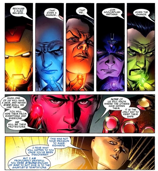 只有在大事情發生時才會現身的觀察者(Watcher)也在此時出現並表達對神奇先生的失望,但是他戴上手套只是希望可以許願將六顆寶石消滅,卻失敗了。於是他決定將寶石分給光明會的眾人各自保管一顆,好確保再也沒人能夠收集它們。