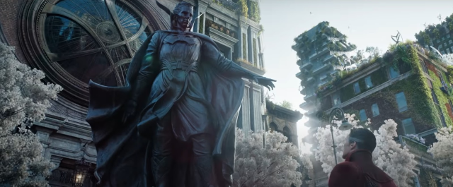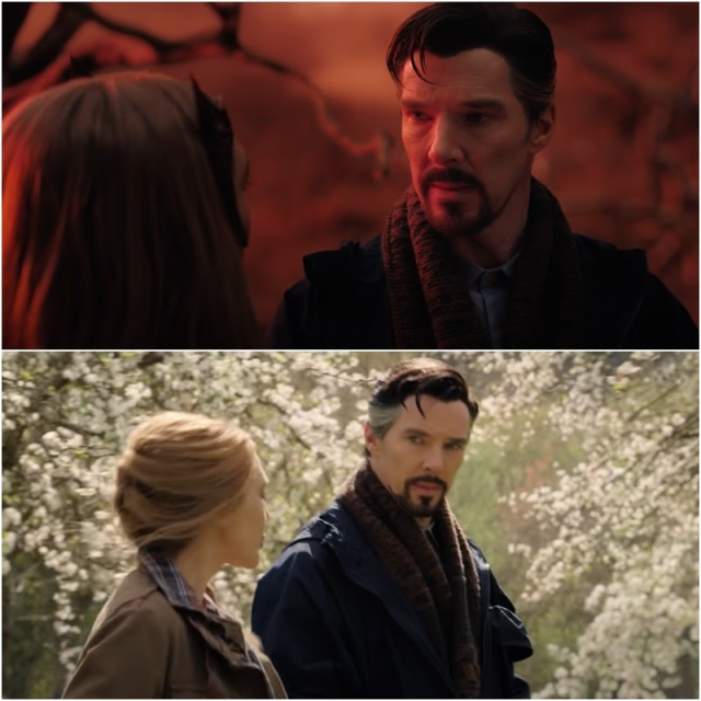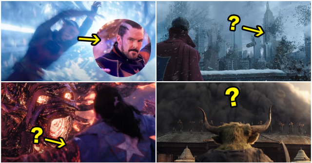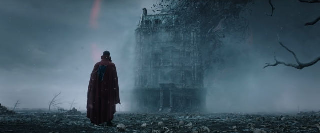 預告一開始史傳奇的畫外音說著,他持續夢到相同的噩夢。這時畫面帶我們來到一片荒蕪中間的至聖所。四周都是人骨和殘骸。這間至聖所明顯比MCU主宇宙的三間至聖所(紐約、倫敦、香港)來得矮瘦,因此這個夢境很大機率是其他宇宙的。