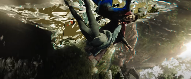 首支預告中介紹過具有穿越多重宇宙能力的「美國女士」艾美莉卡·查韋茲(America Chavez) 可以看到她在某個維度中被形似繃帶的怪物綑綁著,後來她使用自己的能力開啟星形傳送門成功逃脫。