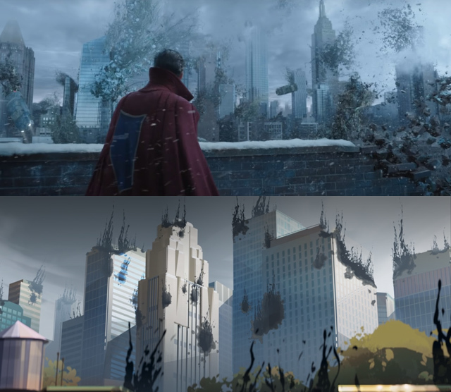 《無限可能:假如...?》第4集《假如奇異博士失去愛人而非雙手》相同的場景,某個現實的史傳奇目睹正在消逝的紐約城。