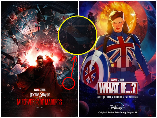 透過本片釋出的最新海報,還可以一窺其他端倪。其中一個碎片反射出了《無限可能:假如...?》中的卡特隊長盾牌。其他詳細的分析可以看這篇文章說明。