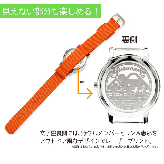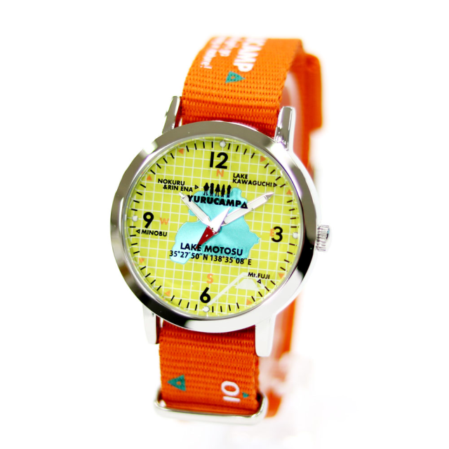 手錶錶面以劇中舞台-本栖湖為中心,地圖的意象為設計的表面圖案,可以看到錶面中心為本栖湖的圖案與經緯度,在各處附有其他地點的英文文字指標,並在上面有著《搖曳露營△》的英文文字與主角五人群的剪影。連秒針都設計為指南針的指針造型,且具有防潑水的功能, 真的帶去露營也無須擔心因為進水損壞。