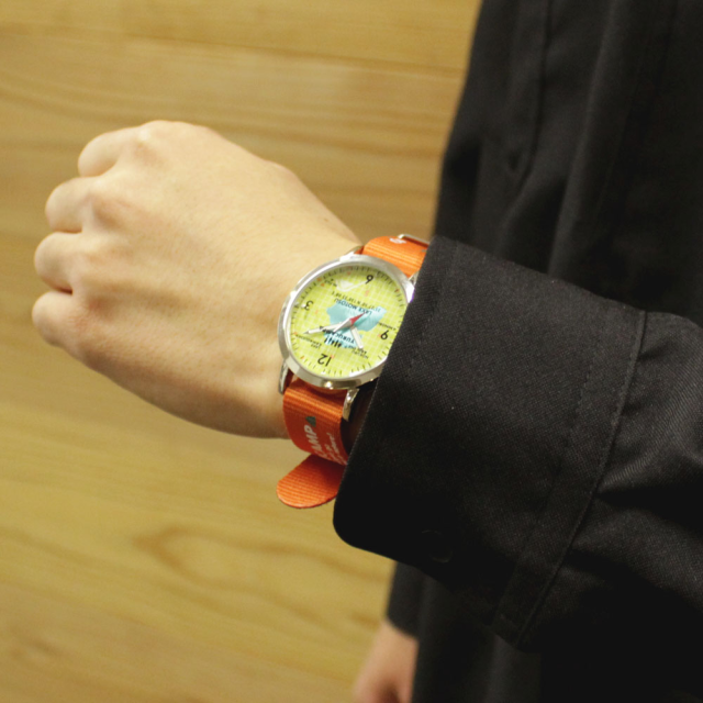 錶帶本體以橘色的顯眼色系,並附有作品的英文名稱與標語。