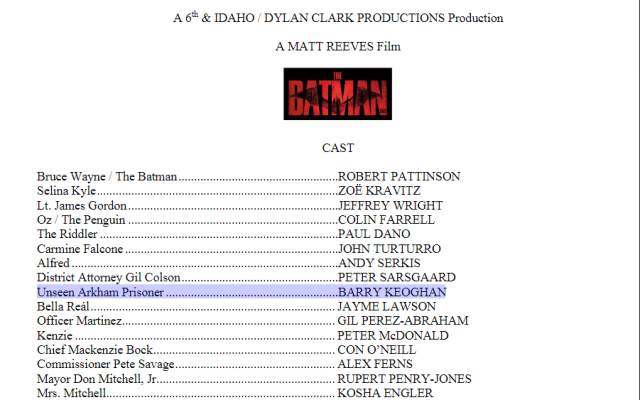 據報導,這是一則由VENGEANCE(@Bat_Source)於Twitter上所發布的一則外流《蝙蝠俠》演員名單,列表當中不只是揭示了參與本片演出的貝瑞·柯根,將在扮演一位「看不見的阿卡漢囚犯」,並且需要經過特殊化妝與假肢登場演出,從這點描述來看,確實讓不少人容易與小丑聯想,似乎更也讓傳聞更接近事實。