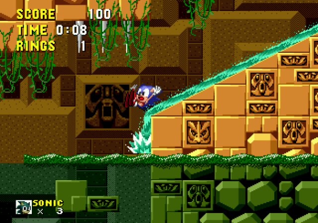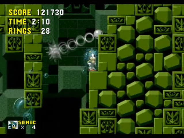 並且在這個「迷宮區域」往下衍生還有水區域的部分讓索尼克探索,不過玩家最多只能讓音速小子待在水裡面30秒,如果超過時間且沒有獲得泡泡來延長在水裡的活動時間,就會因此溺死。