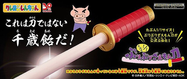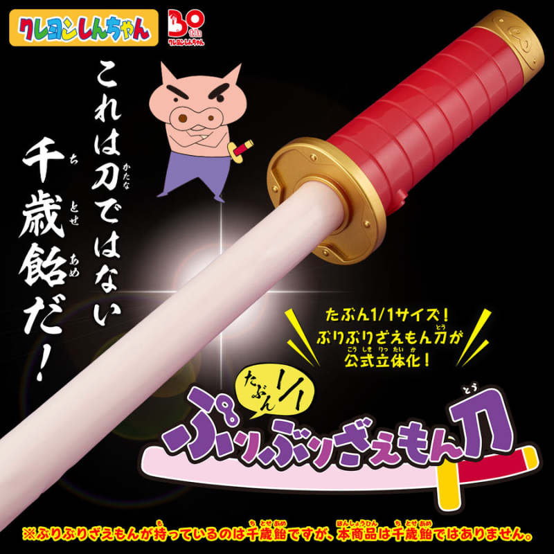 為慶祝《蠟筆小新》30週年,日本 BANDAI 萬代玩具公司推出了將劇中道具實體化的趣味商品「大約1/1比例的肥嘟嘟左衛門的刀」,外型雖搞笑,但商品特別收錄了聲優神谷浩史配音的音效!參考售價為 4,950 日圓,預計 2022 年 07 月發售。