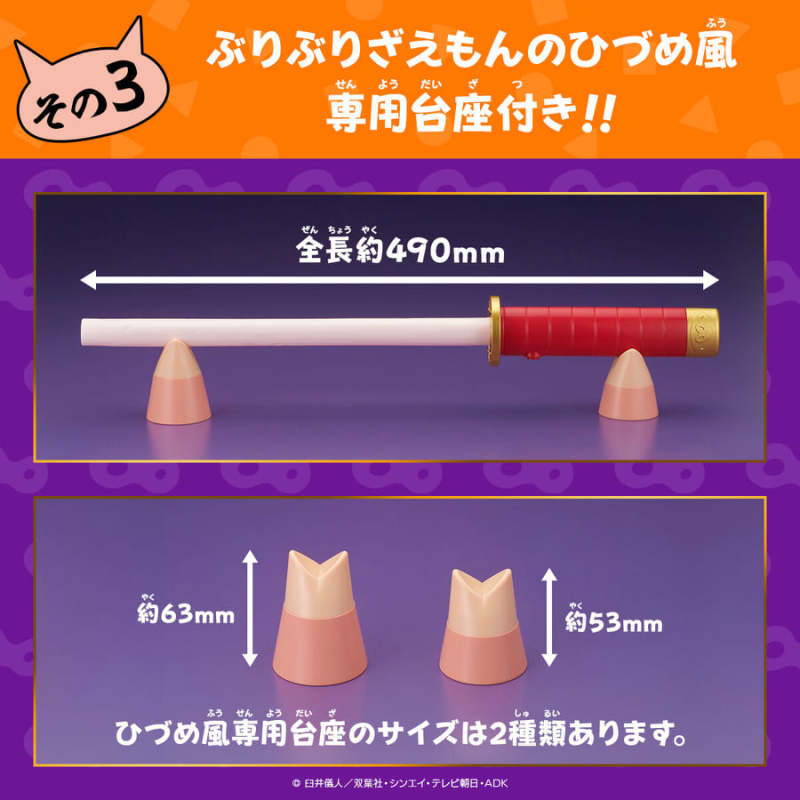 「大約1/1比例的肥嘟嘟左衛門的刀」,尺寸約長 49 公分,外觀徹底還原劇中肥嘟嘟左衛門配戴在腰間上的刀,在簡單的造型中再現劇情裡以千歲飴製的設定,有著凹凸不平的質感表面(豬豬有練過,小朋友不要舔)!按壓刀柄後,收錄有聲優神谷浩史特別錄製的七種新規肥嘟嘟左衛門台詞!另外,還採用肥嘟嘟左衛門的小豬手作為支架,展示起來特別可愛搞笑~