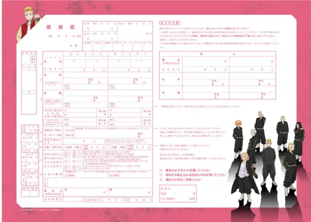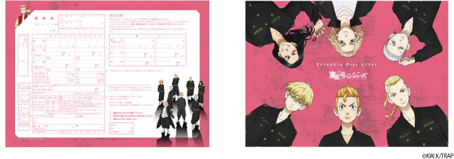 Zexy 4 月號附錄所贈送的結婚證明表,是依照日本當地的官方文件,以粉紅色為主體搭配《東京卍復仇者》的人物設計而成,另一面則為角色人物圖像,並寫上英文字「Friendly Ever After 」。Zexy 官方也提到這次合作,是因為希望每位新人在提交結婚登記時能建立更牢固的聯繫,透過這次的結婚登記設計,讓你感受到《東京卍復仇者》團隊的感覺。