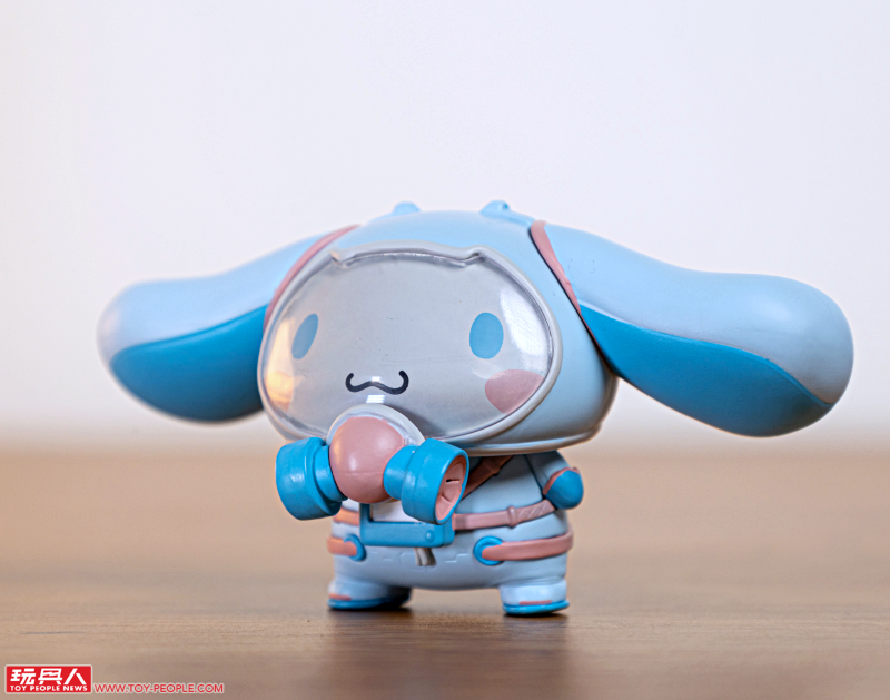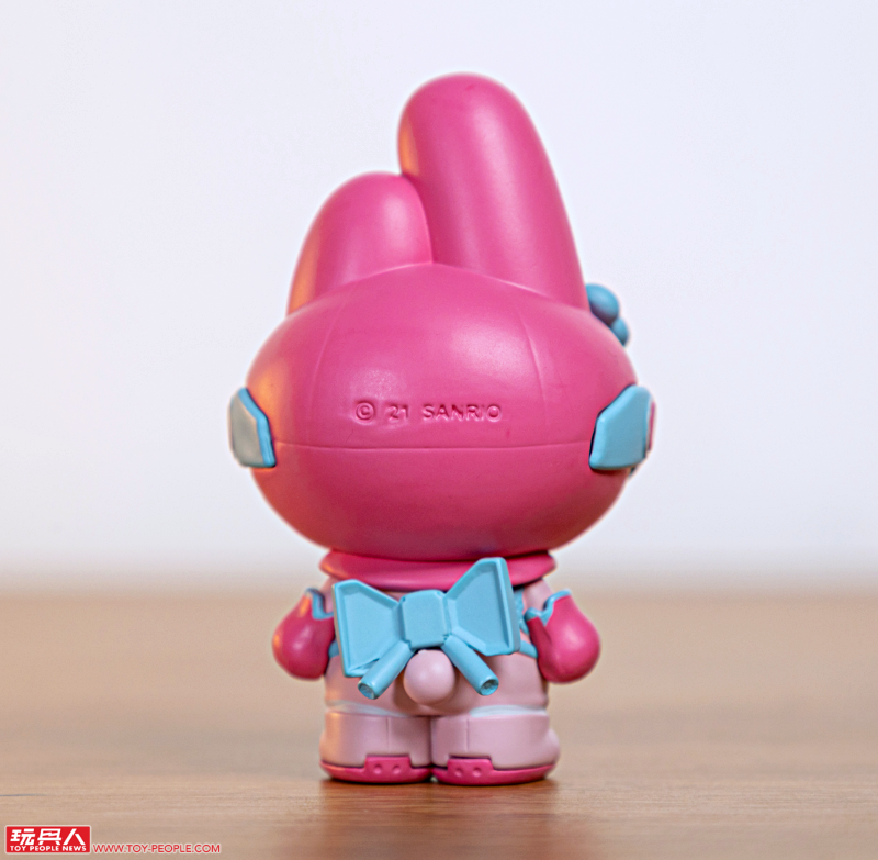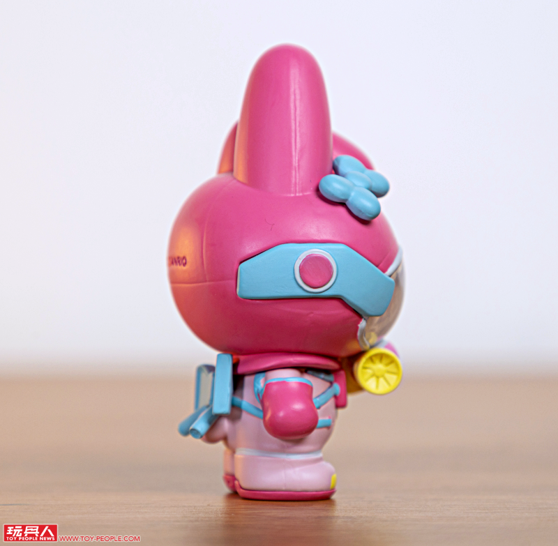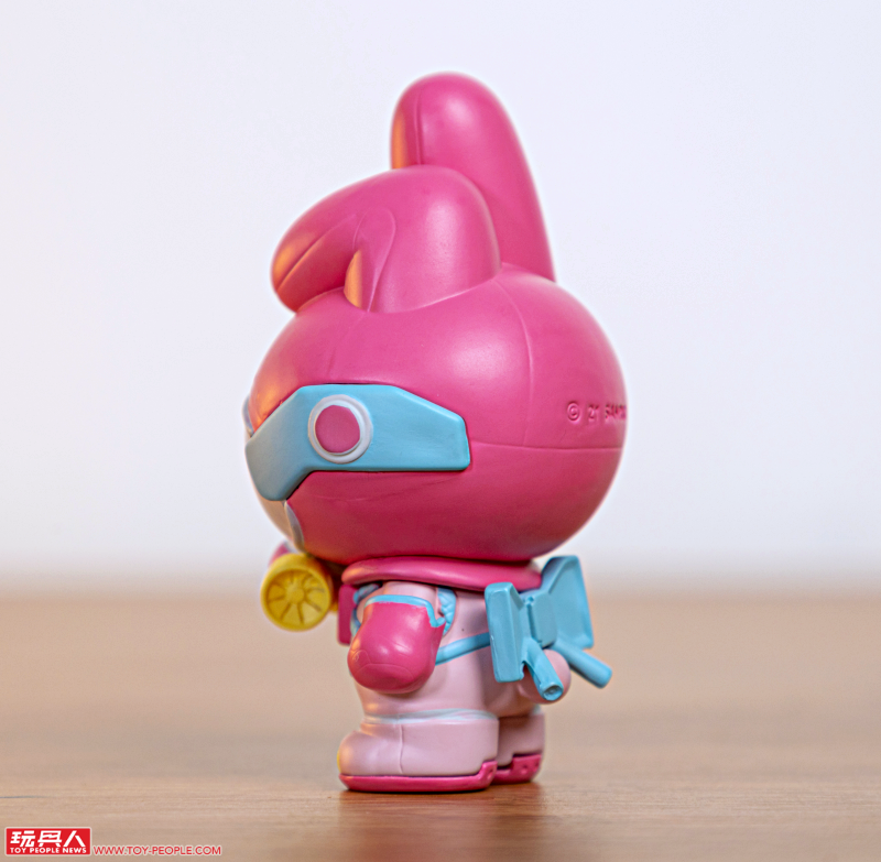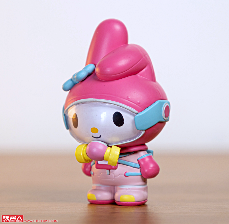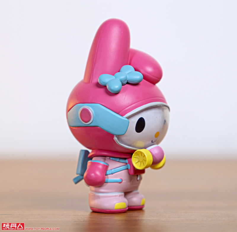 再來是被粉紅色、粉藍色包圍全身的美樂蒂,頭罩兩邊的藍色配件、身後的蝴蝶結給人一種未來感,右耳彎彎的造型特色即使飛上太空也不會改變。