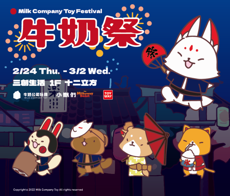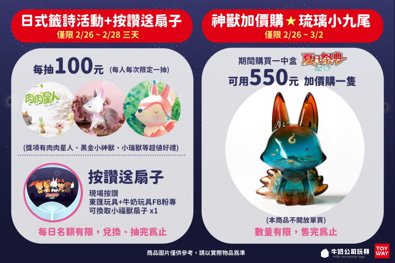 會場將打造日式祭典主題,提供多樣拍照打卡的場景,還有設立扭蛋機與販售牛奶玩具相關商品。 更將在2/26~2/28期間舉行特別企劃!佰元抽獎的【日式抽籤活動】每人每次限定一抽唷(獎項有肉肉星人、黑金小神獸、新年九尾等超值好禮)