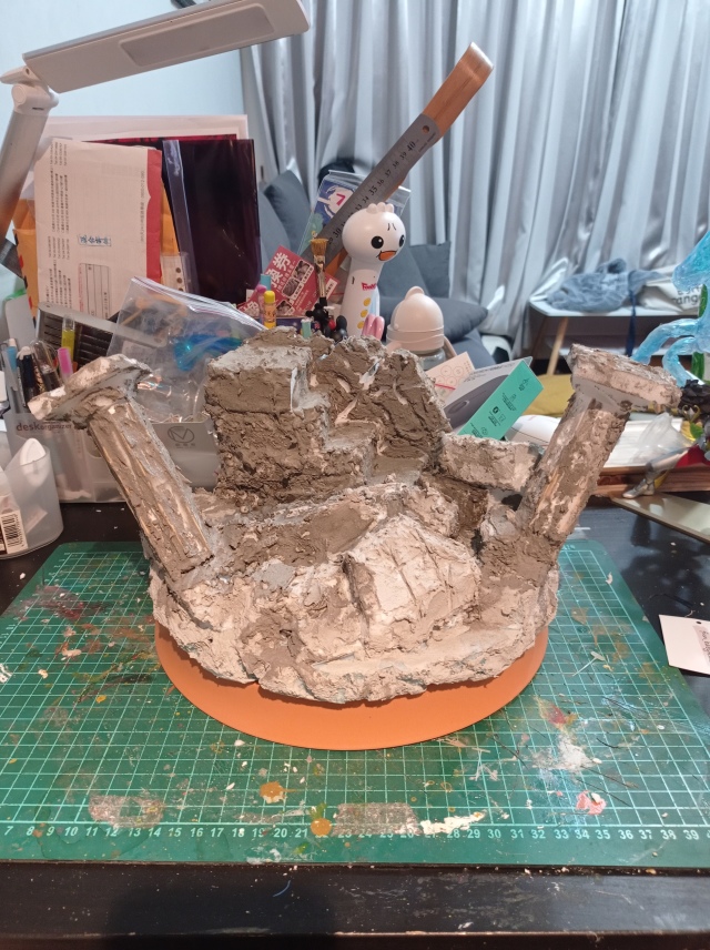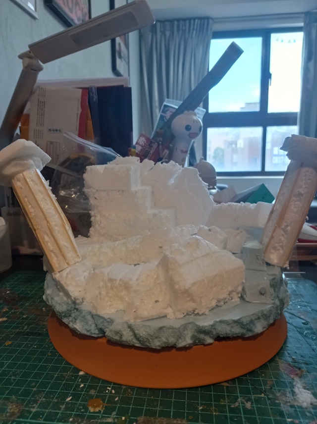 再來是地台的製作,腦海的構想是 羅馬建築式的廢墟 ,羅馬柱紋路的部分是使用牙籤 再加上快速水泥 地基是使用珍珠板跟保麗龍