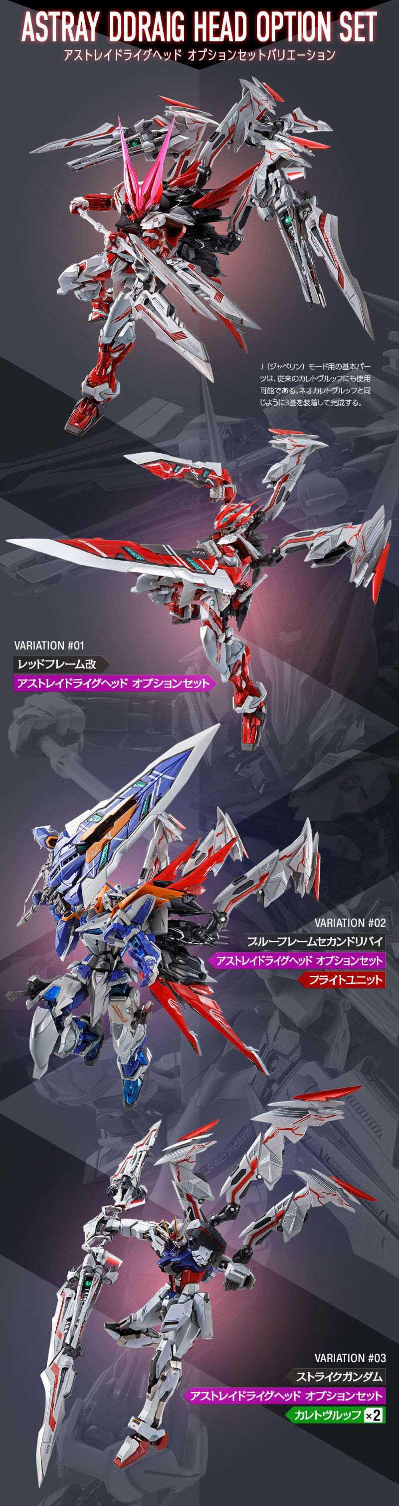 「異端鋼彈 紅龍頭配件組」商品中包含一組異端鋼彈紅龍型特徵的「紅龍頭」&「光束天線特效」,用來重現與闇夜紅龍型不同的頭部造型。不過其餘零件倒是沿用相同的設計,附有烈雷劍 J 模式(戰戟形態)的長柄、3 具烈雷劍的新型基座、能安裝於飛行組件上的 3 組出力增幅器,