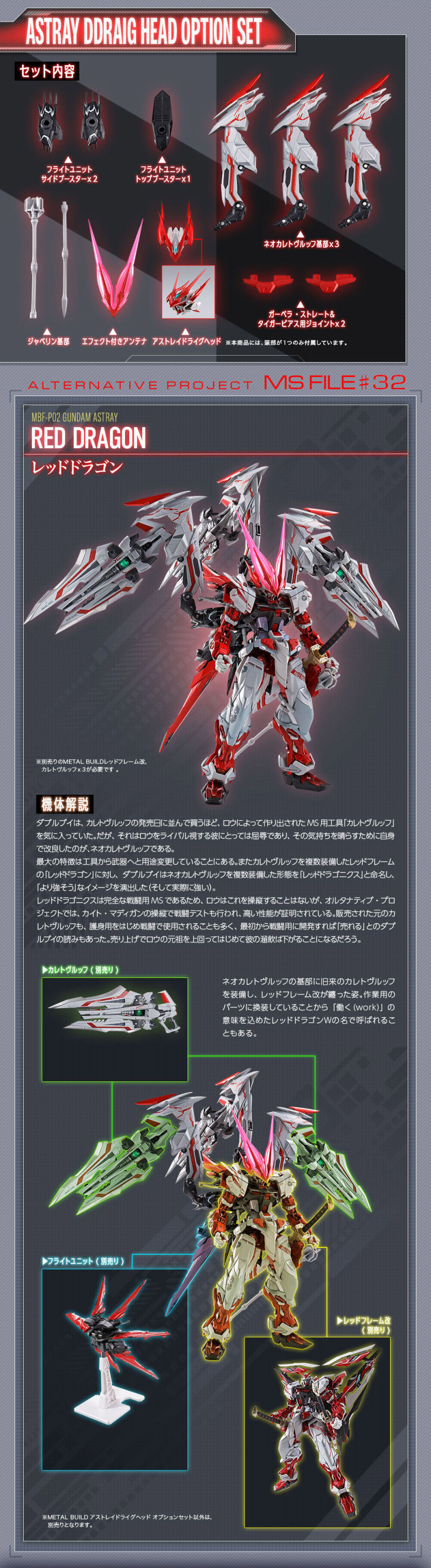 由日本 BANDAI SPIRITS 公司收藏玩具事業部 TAMASHII NATIONS 發行的人氣合金玩具『METAL BUILD』系列今日正式公開出自《機動戰士鋼彈SEED ASTRAY》的最新商品「異端鋼彈 紅龍頭配件組」預計於 2022 年 09 月發售的消息。