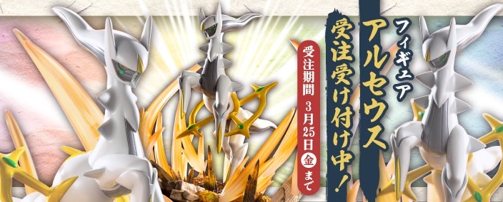 「阿爾宙斯 塗裝完成品模型」,尺寸全高約 290 mm,以遊戲系列概念插畫師幸田和磨的插畫為基礎,將阿爾宙斯使出招式制裁光礫(さばきのつぶて)的場景立體化!在阿爾宙斯的軀體上施以質感的珠光白,並點綴有金色花紋、綠色的寶玉等;在崩裂的石塊與倒塌的神柱之中,交錯著充滿力道的透明特效件,讓整體更具威嚴感,再現遊戲中令人敬畏的模樣!豪華的底座更增強了阿爾宙斯的神性。