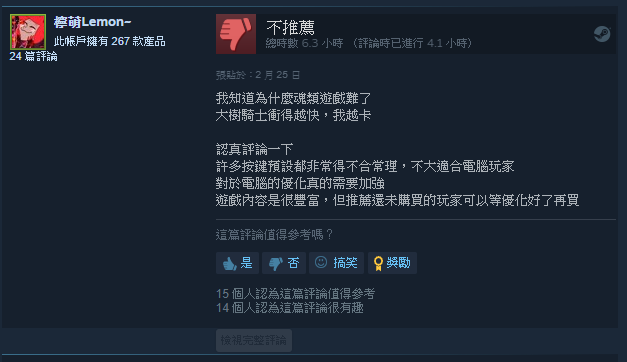 ▼除了卡頓、閃退等問題外,也有玩家點出在按鍵配置上也不夠人性化,但對於遊戲本身的豐富性依舊給予肯定