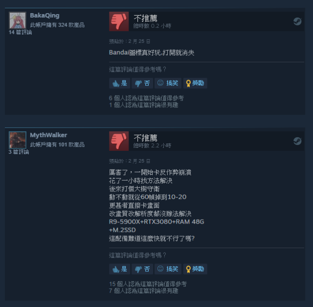 不過,遊戲發售的第一天,家機玩家與PC玩家的評價意外地可說是兩樣情,目前在Steam的玩家評價為褒貶不一,雖然仍有約59%的玩家針對豐富的遊戲性與廣大的開發世界給予絕對的好評,但卻也因為掉幀、卡頓、閃退…等優化問題,當中更有玩家使用3080高階顯卡,也依然必免不了fps驟降問題,因此給予了《艾爾登法環》負評。