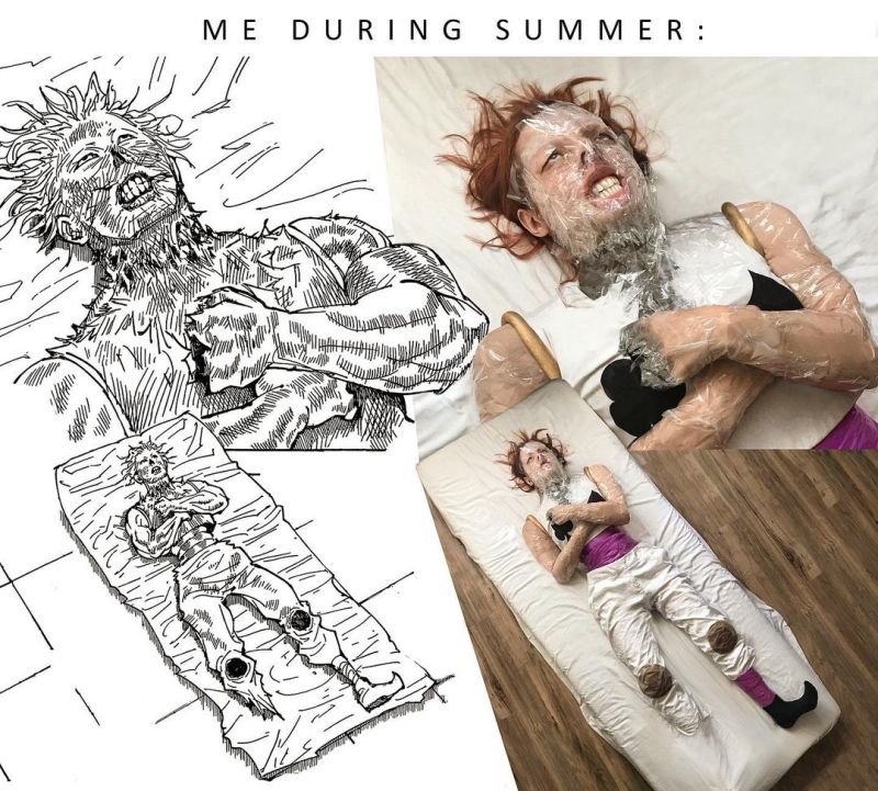 除了根本是西索本人的日常自拍照片之外,Villain Lady 也透過用保鮮膜包裹臉部與身體還原西索的屍體狀態...,連動畫中臉崩的模樣和洗澡時漏出背後的蜘蛛細節等都沒錯過~充滿創意與巧思,不只還原度超高還非常有才啊!
