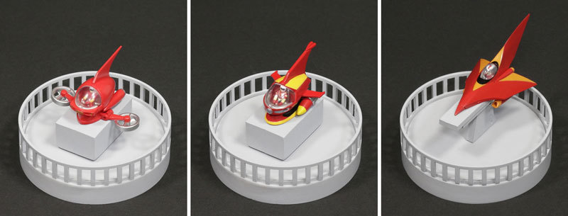 這台由 EVOLUTION TOY 推出的這款Metal Action指揮艇套組,收錄了三款指揮艇,分別是在無敵鐵金剛原作中的初期迴旋指揮艇(ホバーパイルダー),後期的噴射指揮艇(ジェットパイルダー),以及大魔神的指揮艇(ブレーンコンドル)。雖然尺寸較小,但材質接用合金構成,並且還附屬專用的展示台座喔!另外,這三款指揮艇,還可以跟自家的GABN系列的無敵鐵金剛以及大神合體呢!相當特別喔!