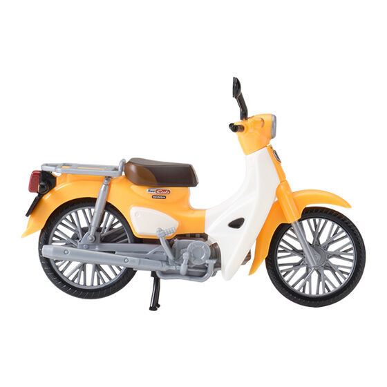 由 Honda 本田公司所推出的 50 cc.四衝程兩輪摩托車發展而來的 Super Cub 車系,因小巧可愛的車身、耐用又穩定的引擎以及經典不敗的造型等特色,成為風靡全世界的車款。轉蛋化分別推出:爾灣牛仔金屬藍、珠光黃、塔斯馬尼亞金屬綠三種配色,除了機械結構,車殼上的貼紙與標誌等也精密呈現~相當令人期待!