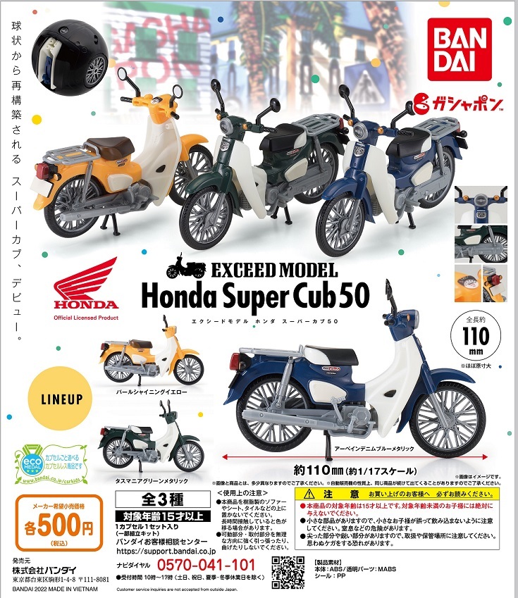 主打超越一般轉蛋水準細緻度的「EXCEED MODEL」系列,這次結合轉蛋的球體結構,將轉蛋設計為可以組出高約 11 公分、具備精密細節的「EXCEED MODEL Honda Super Cub 50」,以 1/17 比例再現全球暢銷的本田小狼~