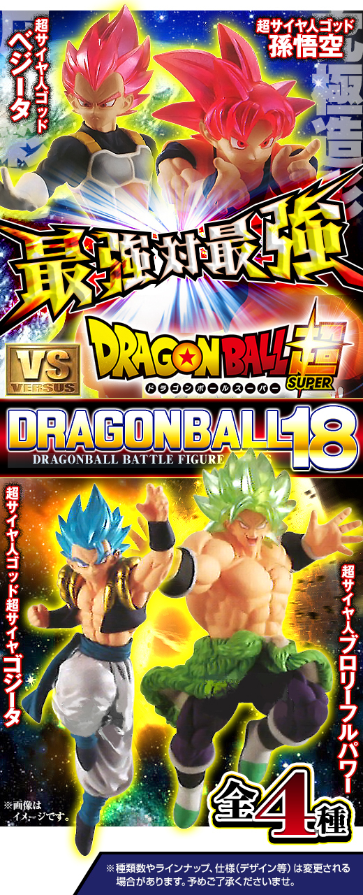本次的第 18 彈「七龍珠超 VS 七龍珠 18」轉蛋,以劇場版《七龍珠超:布羅利》為主題,在 60 ~ 80 mm的尺寸將角色的激戰場景精緻呈現!收錄有紅髮的超級賽亞人神孫悟空、超級賽亞人神貝吉塔以及超籃超級賽亞人之神之超級賽亞人悟吉塔和級賽亞人布羅利 究極全力 四款角色,透明珠光的頭髮以及壯碩的肌肉線條等細節,在小尺寸中發揮地淋漓盡致~