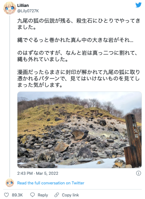 也因此在當地最大一塊殺生石上,特意有著辟邪的注連繩,來鎮壓住九尾妖狐的怨氣。但是推特網友 Lillian 今天PO出一張照片,表示殺生石竟然碎成兩半,而且用來鎮壓怨氣的注連繩也掉到地上。 Lillian 不禁表示「漫畫中解除封印的時候馬上就會被九尾狐附身,感覺我好像看了不該看的東西…」