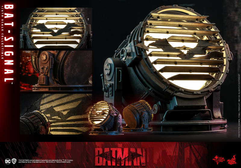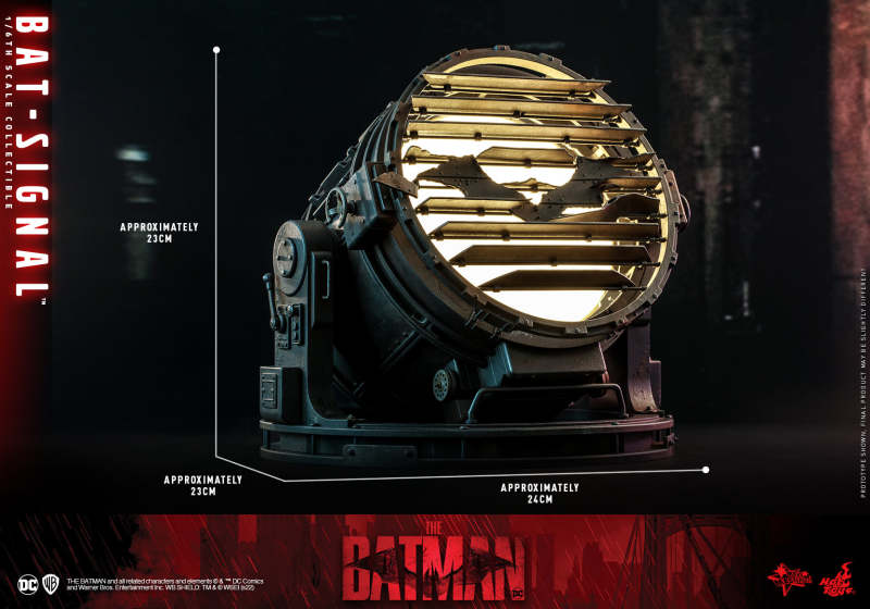 在蝙蝠俠人偶本體之外,Hot Toys 這次也讓呼喚蝙蝠俠的經典道具「蝙蝠信號燈」一併以 1/6 比例立體化,尺寸為長寬高 23×24×23 公分,除了本體的機構細節之外,出色塗裝更展現出信號燈的金屬感、厚重感,以及逼真的舊化痕跡,可利用信號燈的 LED 發光功能、可動的設計,在各處照射出讓罪犯們心生恐懼的標誌!由於「蝙蝠俠&蝙蝠信號燈」套組配備的是豪華版本的蝙蝠俠,所以 Hot Toys 也有提供單裝版本的蝙蝠信號燈發售喔。