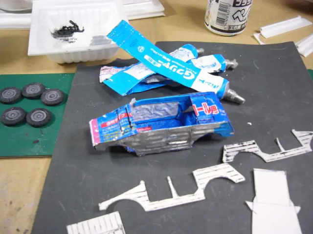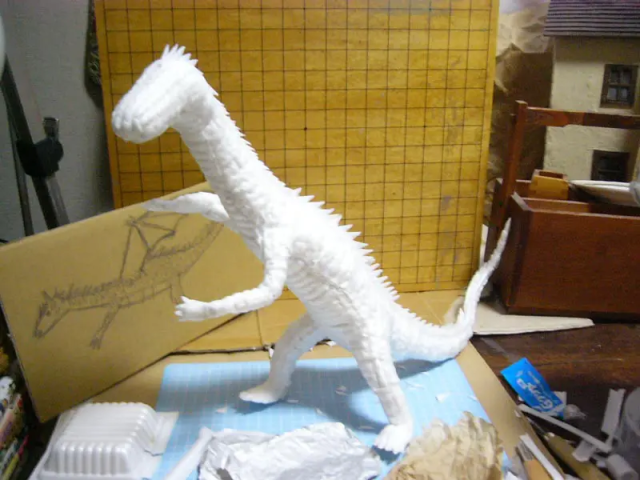 藉著利用納豆盒的保麗龍素材,一個個貼上讓本體的身軀不再單薄。