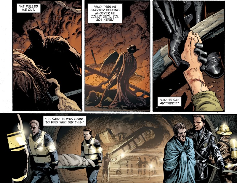 ▼出自“Batman:Earth One” 在《蝙蝠俠:一號地球》,蝙蝠俠同樣拼命阻止謎語人安裝在電車上的炸彈陷阱,向所有被困其中的民眾伸出援手。 Image credit:DC Comics