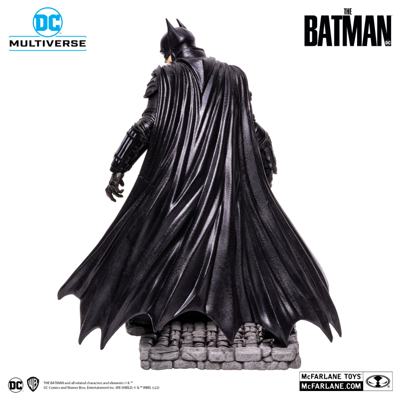 THE BATMAN 12″ POSED STATUE根據劇中的造型設定,採用冷鑄樹脂手工製作,以約 30 公分的尺寸還原蝙蝠俠造型細節,身穿著新版的蝙蝠戰衣,手持蝙蝠飛鏢,在僅露出嘴部的範圍裡刻劃出羅伯派汀森的特色下巴線條。在面罩、靴子等處施以皮革質感的紋路與光澤塗裝,身後飄逸的披風更是顯現霸氣!附有令人聯想到高譚市屋頂的磚頭底座,以及收藏藝術卡等,享受劇中世界觀~