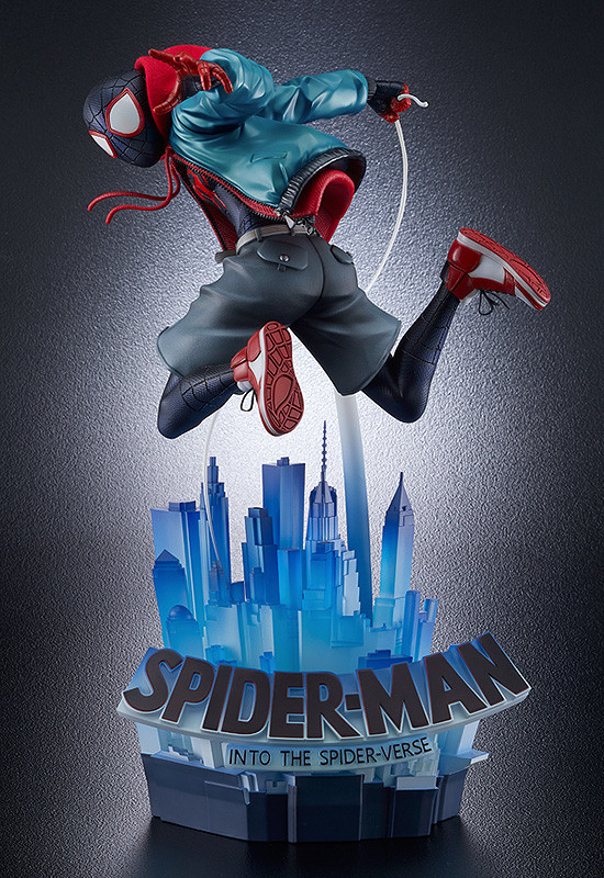 以《蜘蛛人:新宇宙》電影主視覺為題、採用 1/6 比例立體化的「邁爾斯·摩拉斯:崛起」高約 37 公分,有著濃厚的主題感與躍動的視覺效果,邁爾斯身為新一代蜘蛛人、能在半空中輕盈擺盪的靈活姿態可說是栩栩如生,本作也還原了紅黑主調的蜘蛛貼身戰衣、連帽外套與短褲的服裝搭配,而且紅色兜帽是以布料縫製,能夠自由穿戴,增添展示變化性,如果球鞋上的勾勾可以完整再現就更完美啦!