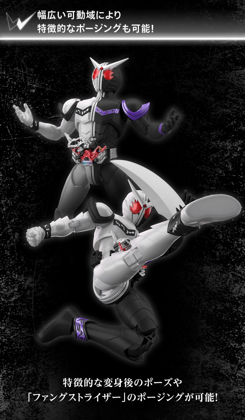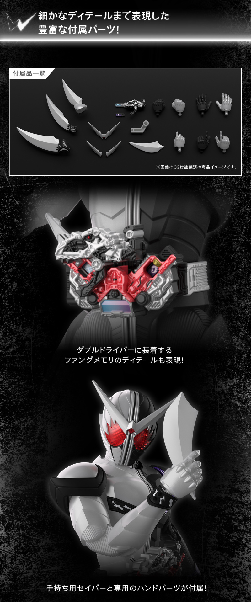「Figure-rise Standard 假面騎士W 尖牙王牌形態」延續過去 W 系列左右半邊可獨立替換零件的玩法,運用多樣新規零件再現右側尖牙(FANG)形態造型武裝、恐龍模樣的尖牙蓋亞記憶體,可再現尖牙蓋亞記憶體安裝於雙重驅動器的模樣。