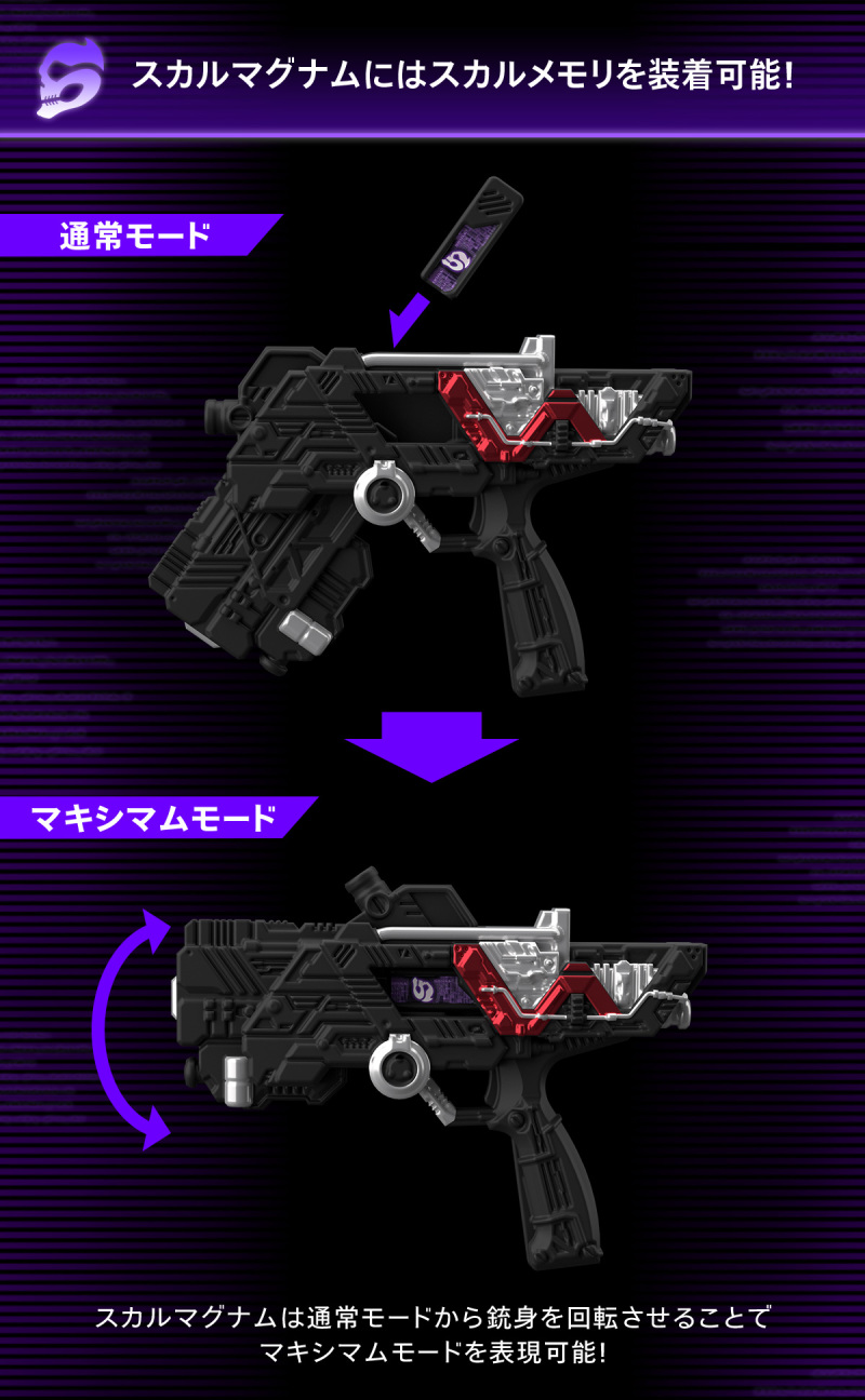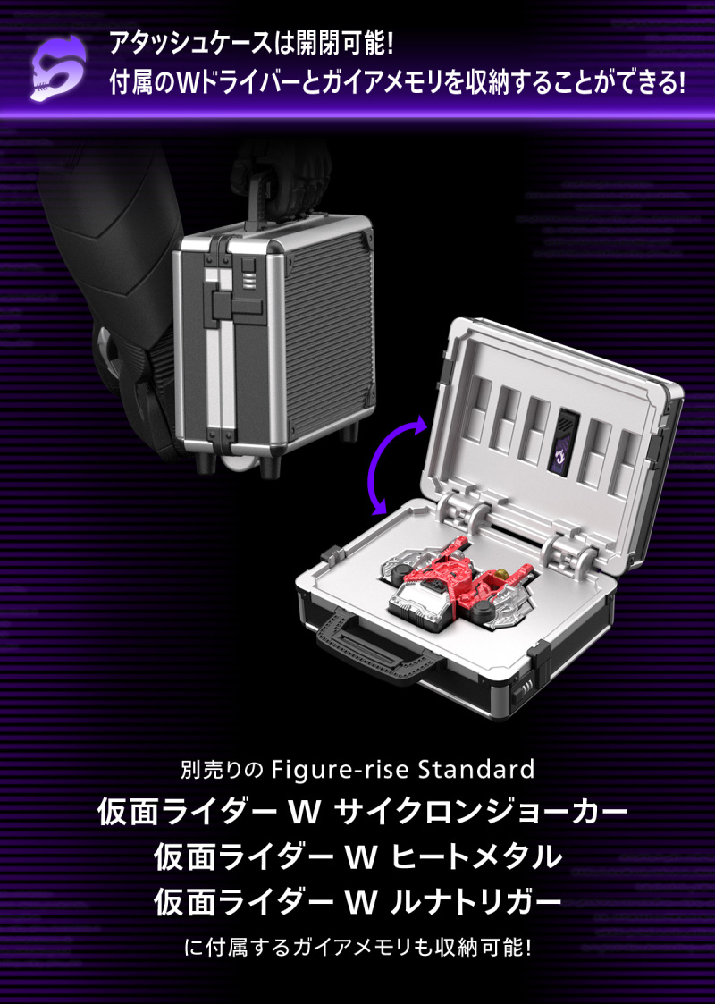 武裝部分則有可放入蓋亞記憶器、旋轉槍身的專用武器「骷髏麥格農槍」。另附上多種替換造型手掌,以及可收納雙重驅動器與 W 初期六種蓋亞記憶體的箱子!