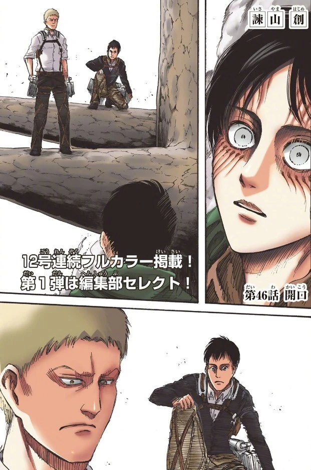 其《進擊的巨人 全彩版》第1卷收錄內容則包含了第46話〈開口〉、第69話〈友人〉,以及第81話〈約定〉等章節,藉由全彩化,來讓這幾幕經典名場面來更加凸顯劇中魄力。