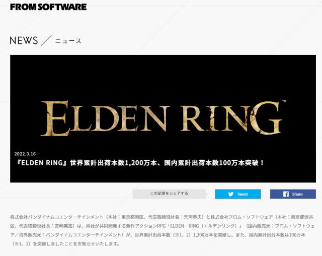 據官方表示,結算至2022年3月4日為止,目前《艾爾登法環》的全球銷售量已經正式突破了1200萬套大關,而日本地區方面則是超過100萬套的成績,當然這當中是包含了各大平台的實體板與數位版的銷售數據。